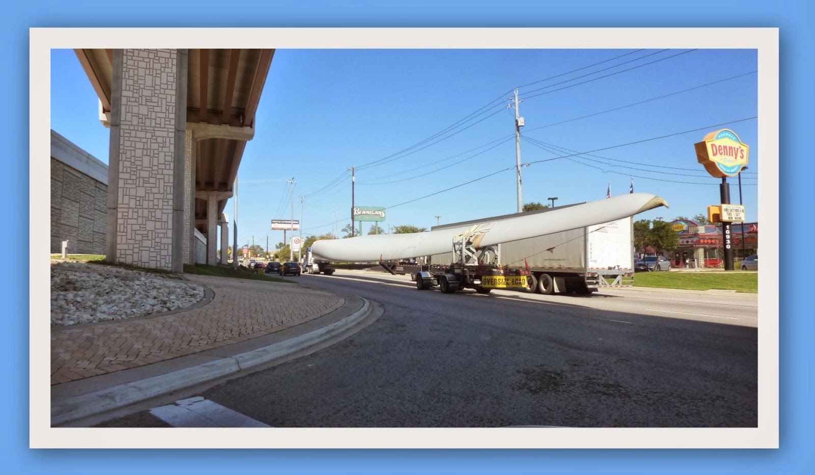 I was marveled by the size and scale of this single "wing looking blade" as the driver carefully edged his cargo through daytime traffic passing my vehicle. The sight of this was rather stunning, as you can see by the photo below, this thing dwarfed everything, even the trailer truck next to it!