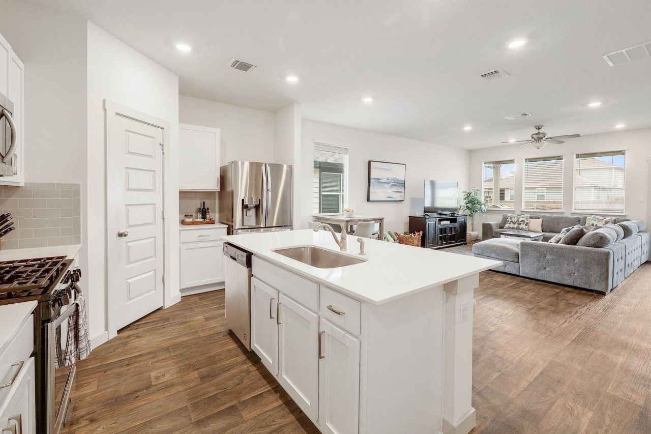 New roof 2025! Welcome to this beautifully designed single-story home built in 2022, offering four bedrooms, two baths, and a thoughtfully planned open-concept layout. The spacious kitchen features quartz countertops, stainless steel appliances, modern cabinetry, a large island, and an oversized pantry, all flowing seamlessly into the dining and living areas?ideal for entertaining or comfortable daily living.Additional interior highlights include extra shelving in the closets for exceptional storage and organization, a rare upgrade that enhances functionality throughout the home. The private primary suite provides a relaxing retreat with a walk-in shower and generous closet space, while three additional bedrooms offer flexibility for guests, a home office, or hobbies.Outside, enjoy a covered patio, full irrigation system, and a new roof, all contributing to easy maintenance and outdoor enjoyment. Located near the neighborhood playground and just minutes from local favorites such as Jack Allens, Chuys, the Co-Op District, downtown Hutto, and Hooky, with convenient access to SH-130 for commuting.