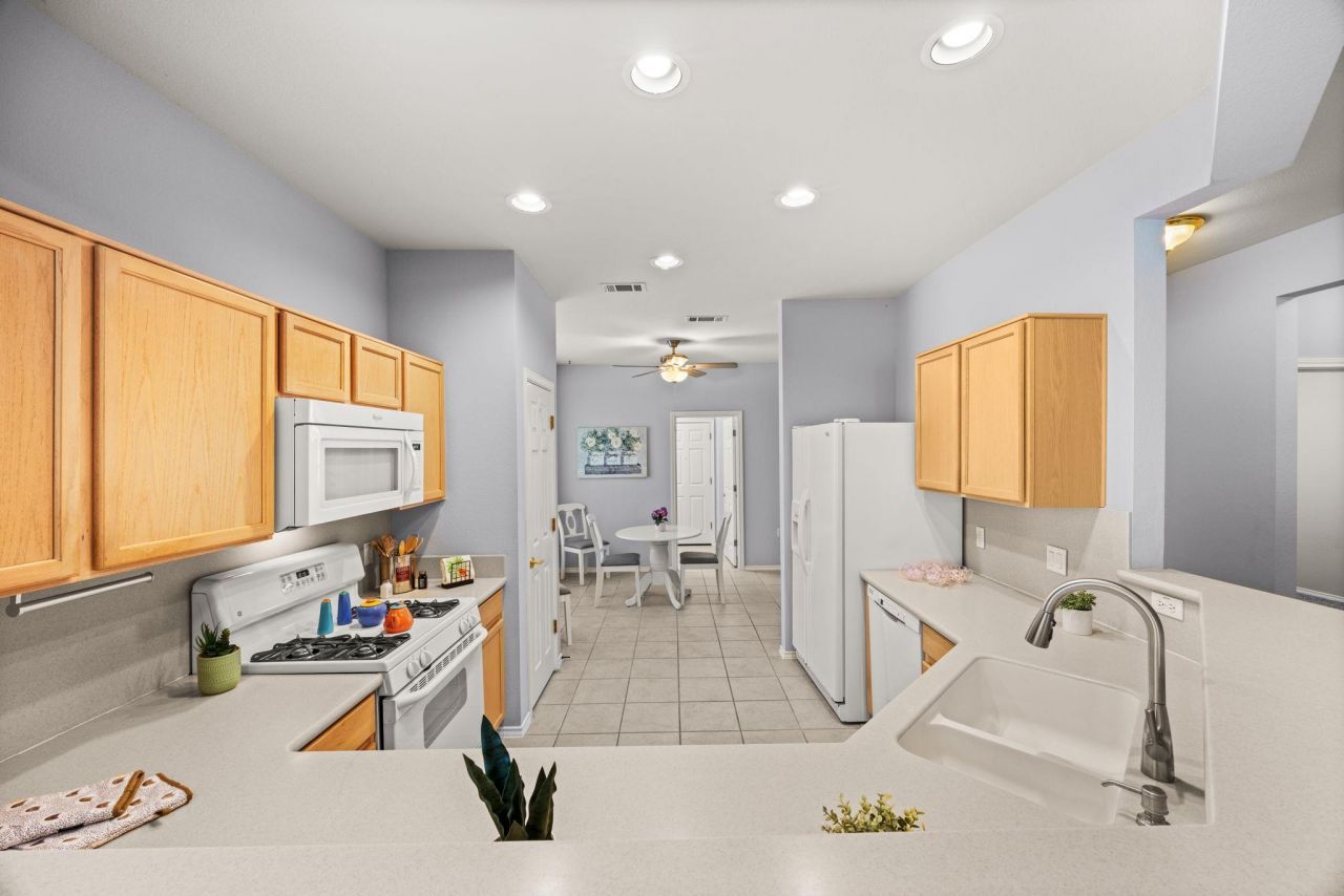 Sun City is a 55+ Community. This 2-bedroom 2 full bath Duplex includes a Cummins Back-Up Generator, lawn care for the front, and side yard from the HOA. The kitchen and dining area have tile floors. Refrigerator, Washer, Dryer and Water Softener are included. Great natural light flows in through the glass patio doors. The backyard has a covered patio and a wrought iron fence. The Dishwasher, Microwave, Water Softener, and Water Heater were recently replaced. There is a Cummins backup generator and solar screens which were recently installed. Club House, Fitness Center, Golf Course Access, Tennis Courts, Walking/Jogging/Bike Trails. The home is staged, and the staged items can be purchased.