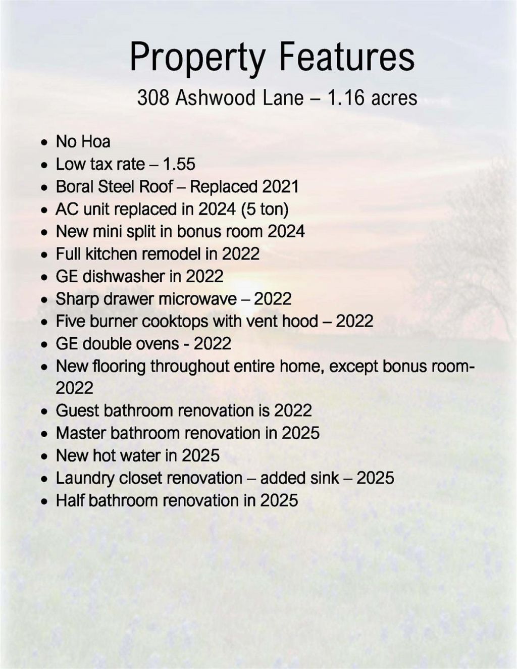 Beautifully Renovated Single-Story Home on 1.16 Acres with NO HOA & Low Tax Rate! Situated on a quiet cul-de-sac in the sought-after Oakcrest Ranchettes community, this 3058 sq ft, single-story 4-bedroom, 2.5-bath home with a bonus room was renovated in 2022?2023 and offers privacy, space, and modern comfort.The open and inviting floor plan features a large kitchen island with double oven, microwave, coffee bar and island cook top that flows into the family room, highlighted by a wood-burning stone fireplace, vaulted ceiling & double glass doors that fill the house with natural light. The private primary suite opens directly to the back porch and includes a split-unit A/C for enhanced comfort with a full bath with an oversized shower and double vanity. 3 additional bedrooms and a bonus room with a split ac of its own, provides flexibility for use as a home office, game room, or man cave.Boral Steel roof was replaced in 2021, Ac unit replaced in 2024, new water heater in 2025 and full kitchen remodel in 2022. Beautiful lot with mature trees, detached garage with storage, shed and carport for all your outdoor toys! Conveniently located less than one mile from the San Gabriel River, Chandler Park & Georgetown Country Club, this property offers the perfect balance of privacy, recreation, and accessibility. A rare opportunity for updated acreage living in Georgetown?dont miss it.